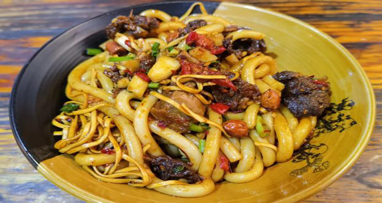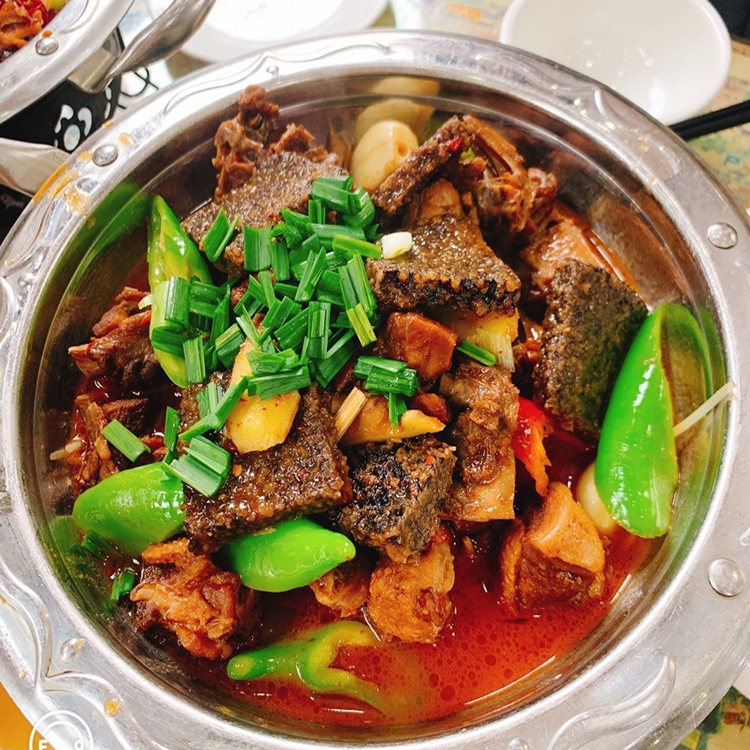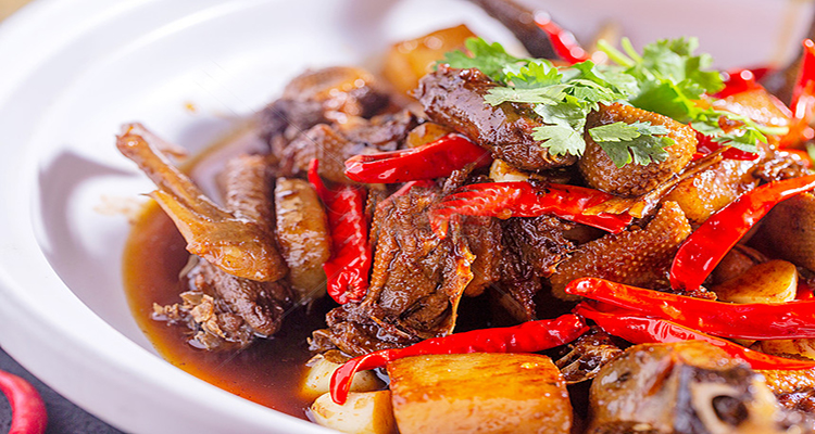 洪江血粑鴨是湘西極具代表性的一道菜肴,味道濃郁,美味獨特。把鴨肉放入到油鍋中,加入干辣椒、生姜、調味食材、糯米等一起翻炒,把鴨肉炸出油后倒入清水和鴨血小火燜煮,直至鴨肉酥爛。嘗上一口滿嘴油香,鴨肉酥爛入味,鮮味十足,極具風味。