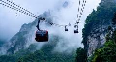 天門(mén)山索道全長(zhǎng)7455米,水平高差1279米,沿線(xiàn)盡為絕壁天險(xiǎn),氣勢(shì)沖天,是世界上最為壯觀(guān)的索道之一。它以張家界市中心城市花園為起點(diǎn),經(jīng)民間田園風(fēng)光而達(dá)山頂?shù)脑伎罩谢▓@,猶如一道彩虹飛渡“人間”“天上”。