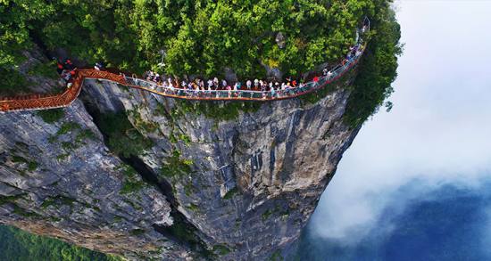 棧道全長(zhǎng)1600米,平均海拔為1400米,起點(diǎn)是倚虹關(guān),終點(diǎn)到小天門(mén)。與其他棧道不同的是,鬼谷棧道全線(xiàn)既不在懸崖之巔,也不在懸崖之側(cè),而是全線(xiàn)都立于萬(wàn)丈懸崖的中間,給人以與懸崖共起伏同屈伸的感覺(jué)。 站在棧道上俯瞰群山,古人“會(huì)當(dāng)凌絕頂,一覽眾山小”的感覺(jué)油然而生。由于天門(mén)山是國(guó)家森林公園,植被特別豐富,加上典型的喀斯特地貌,所以,在這條棧道上更能找到一種在乘坐直升飛機(jī)飛越熱帶雨林大峽谷的感覺(jué),這平時(shí)只能在電影里看到的場(chǎng)景,在這里能讓你身臨其境。 由于海拔和氣流的影響,很多小鳥(niǎo)都不能到達(dá)與棧道平行位置。所以,站在這里,腳下是沒(méi)有邊際的綠野,成群的小鳥(niǎo)在峽谷中嬉戲,偶爾有老鷹從眼前掠過(guò),閉上眼,挺著發(fā)麻的雙腿,帶著急促的心跳,伸開(kāi)雙臂,你就能得到一次最完美、最刺激、最貼近自然的SPA。因?yàn)?,要知道這種在懸崖上賞風(fēng)景一般都是非人類(lèi)所能享受的。 如果是雨前雨后,在棧道上則是身邊霧氣盤(pán)繞,腳下云海翻騰,令人抬腿似生霧,邁步如踏云,人間天界,世外洞天也就是如此了。 據(jù)施工人員介紹,此條棧道也是他們所修棧道中施工最難,最險(xiǎn)峻的一條。如果您還覺(jué)得不夠刺激的話(huà),在棧道的完結(jié)處的兩個(gè)懸崖之間有一條長(zhǎng)160米的懸索吊橋,同時(shí),在海拔最高點(diǎn)還有一個(gè)挑戰(zhàn)心里極限的玻璃站臺(tái),在這里,如果你能挺直腰板伸開(kāi)雙臂,那么,您就是真正的勇士了。