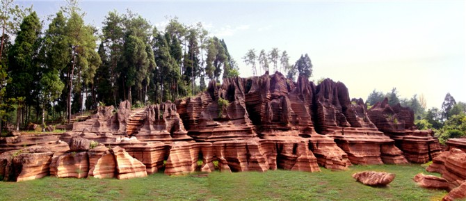 據(jù)地質(zhì)專家考證:紅色石林巖石形成的歷史約4。5億年,地質(zhì)史上稱之為揚子古海(海底沉積了大量混合泥沙的碳酸鹽物質(zhì),經(jīng)地殼運動和侵蝕、溶蝕作用形成了這片美麗的地質(zhì)奇觀)。景區(qū)內(nèi)遍布高大奇石,造型各異、顏色變化多端,且隨天氣、時間、季節(jié)變化而變化,晴紅雨黑、陰轉(zhuǎn)褐紅、晨昏有別。 景區(qū)內(nèi)石景有:蜀犬吠日、乳燕待哺、樓蘭古城、蝸牛搬家、七彩迷宮、利劍刺空、航母巡游、石兵列陣、少女出浴、觀音坐蓮、石鞭候主、靈龜探海、粽熊迎客、天狗吠日、水獺望云、母雞搗窩、駝鈴聲聲····尤以“巨人圓”、“古城故宮”、“八卦奇陣”、“諸葛藏書”為奇石絕景中的最佳。 景區(qū)內(nèi)還有地下溶洞、絕壁天坑、神秘地坑、千年古木、土家山寨、土風(fēng)民俗、集商遺址····